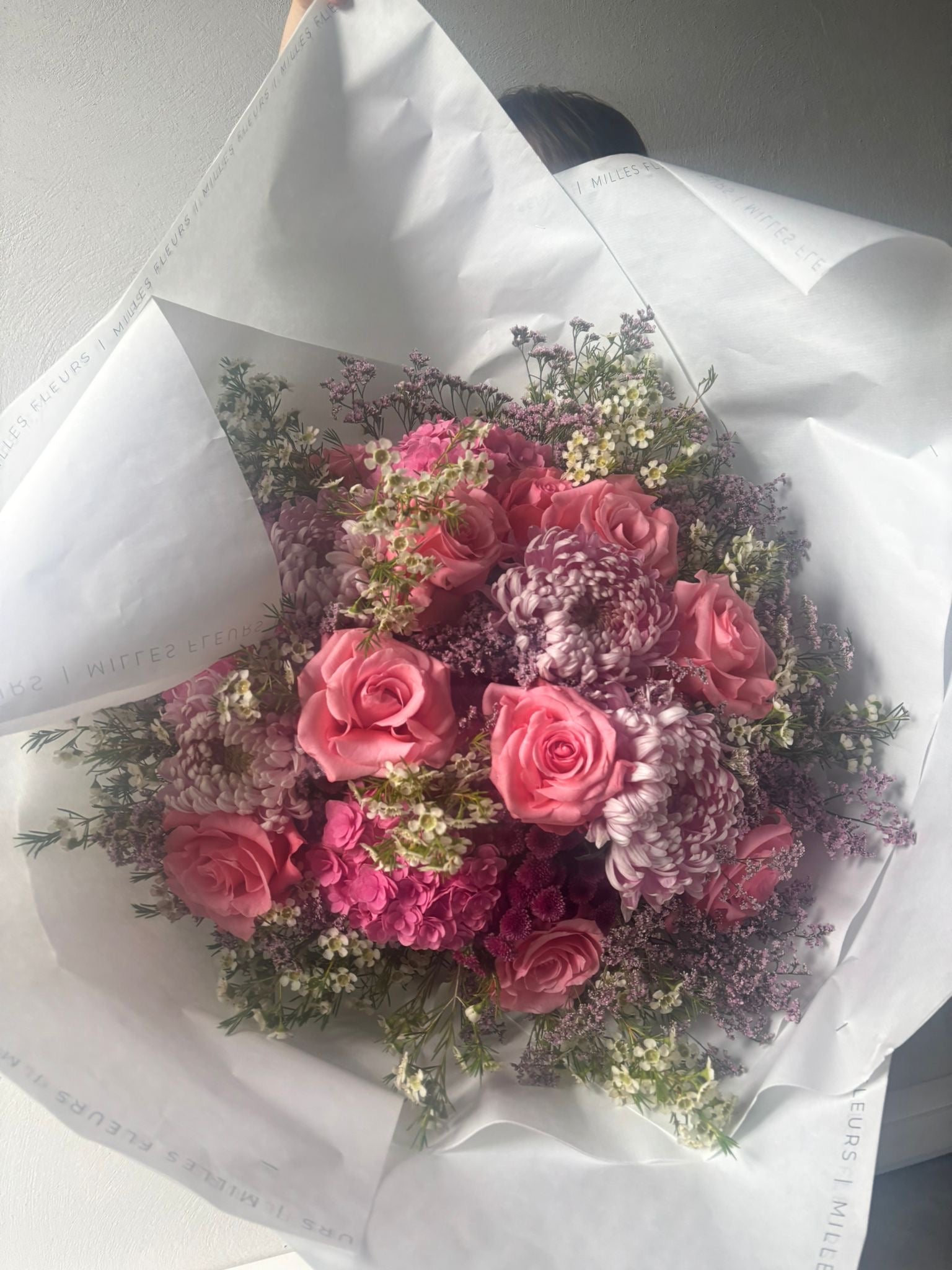 2x pink gypsophila, 3x carnations, 3x eustoma, 2x polyantha roses, 1x gift box. Bound pure.