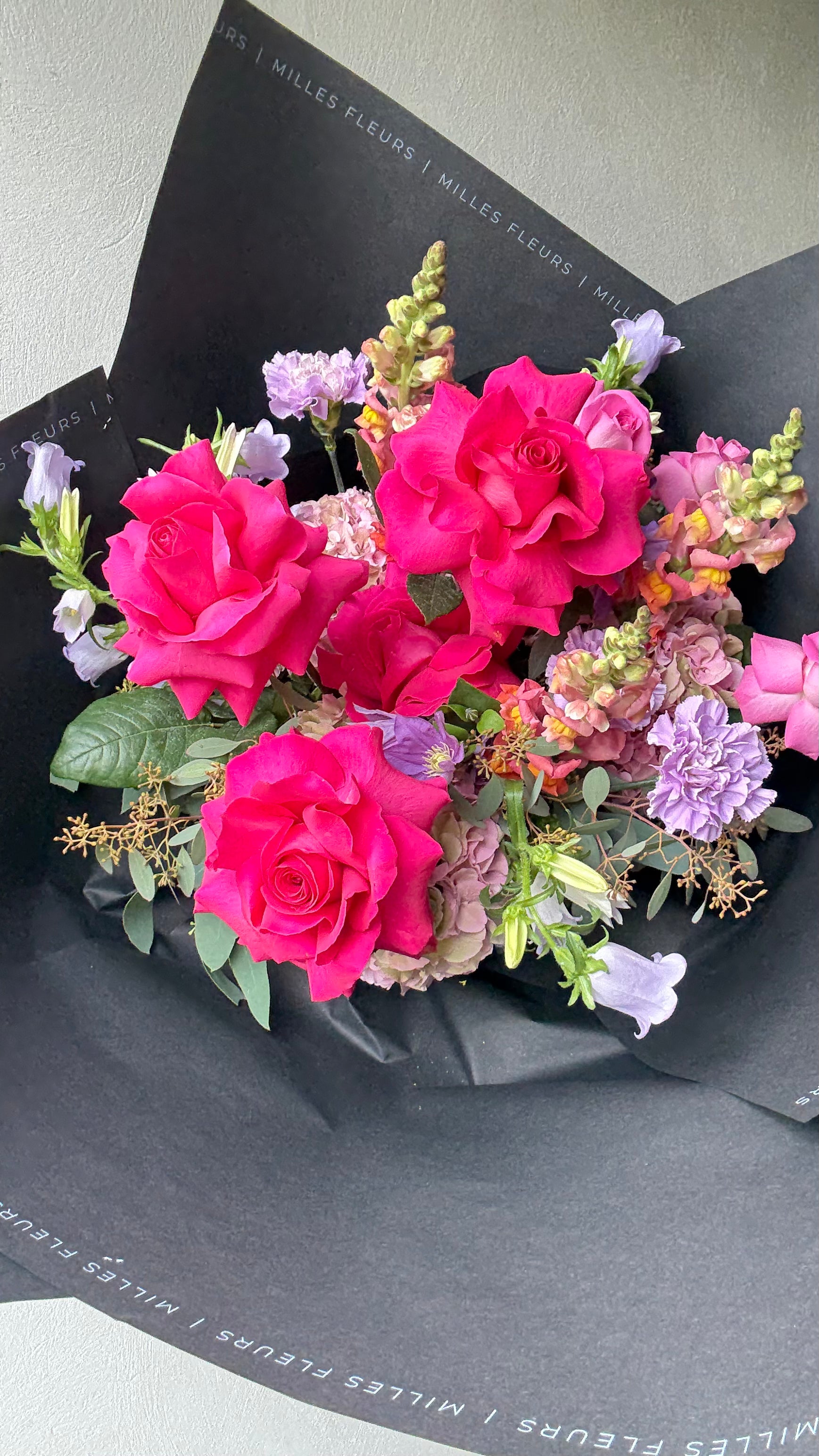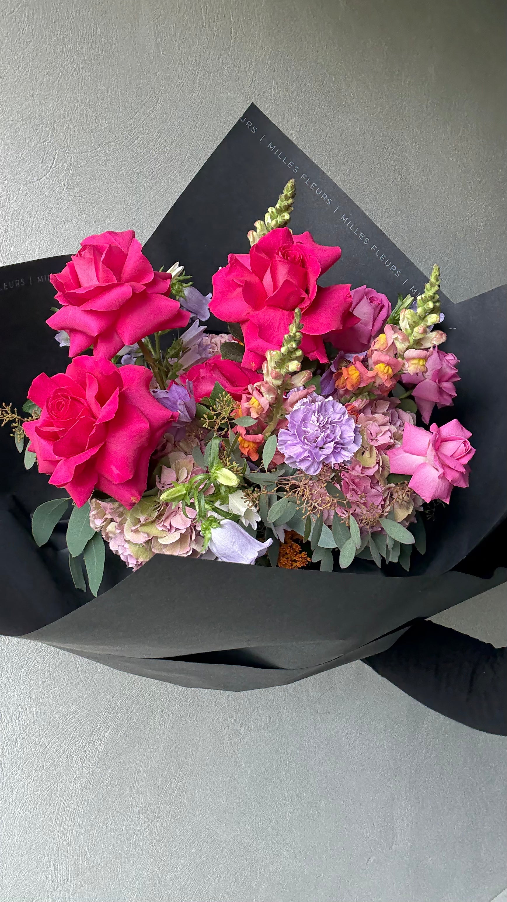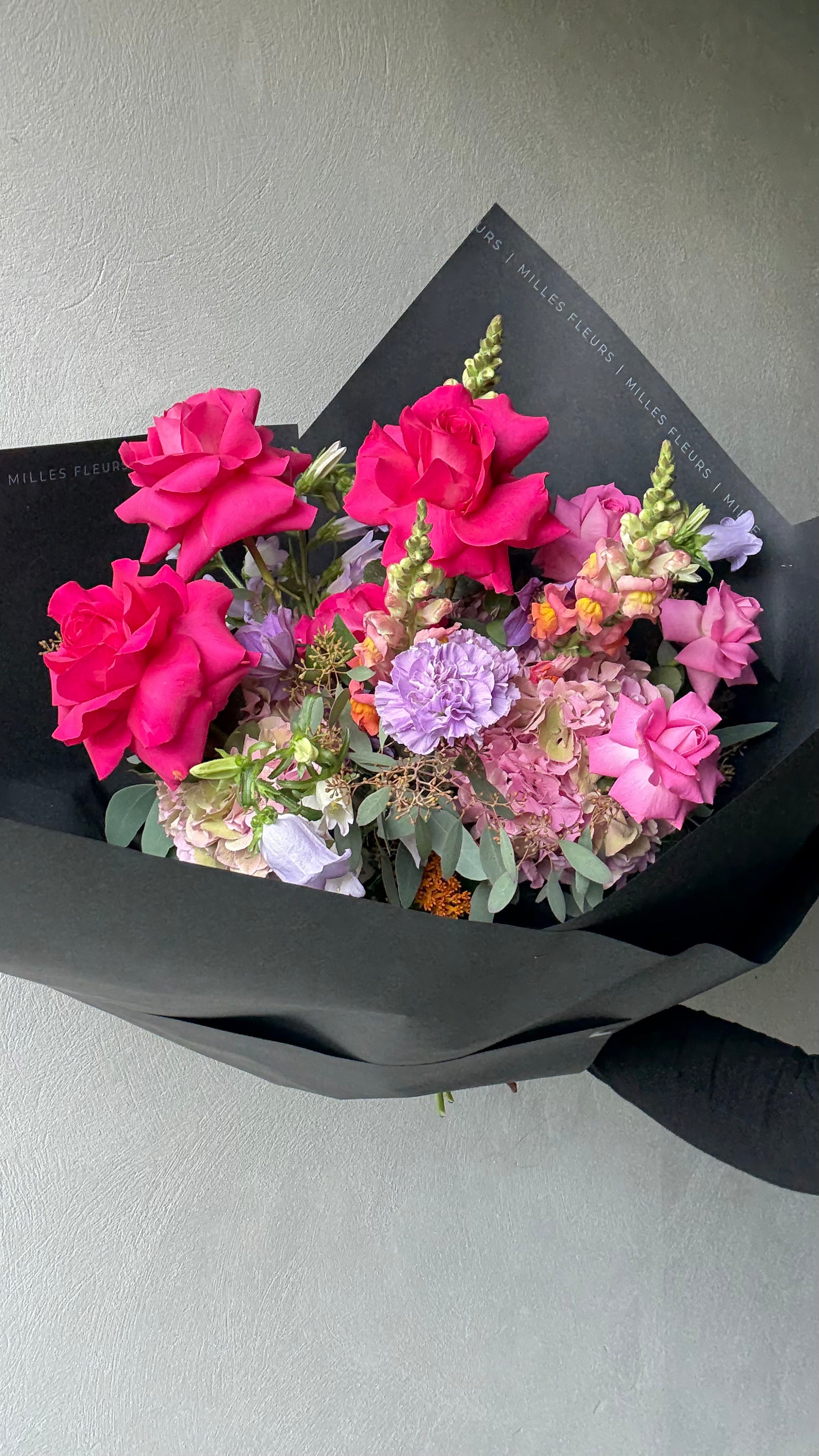 2x pink gypsophila, 3x carnations, 3x eustoma, 2x polyantha roses, 1x gift box. Bound pure.