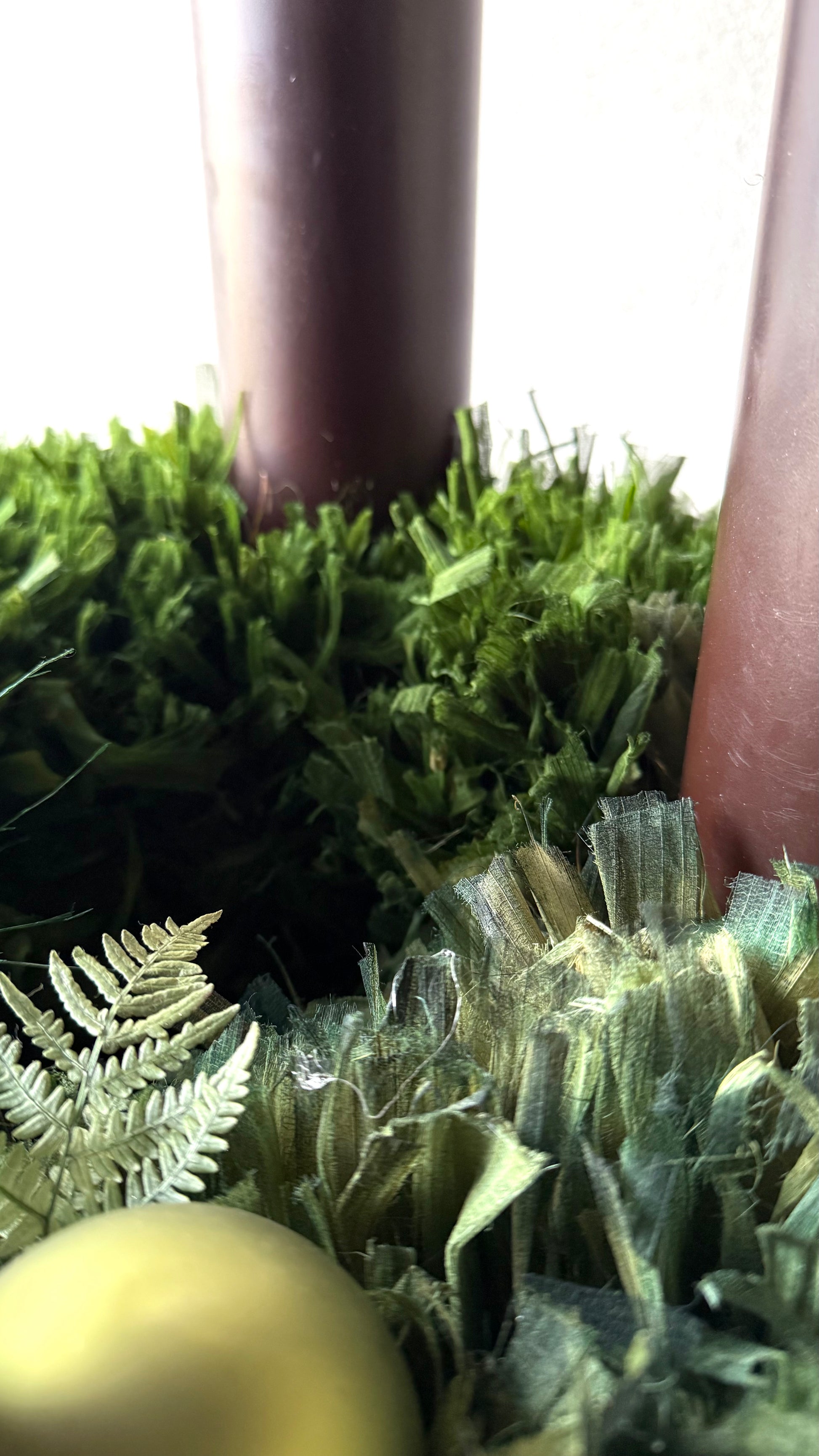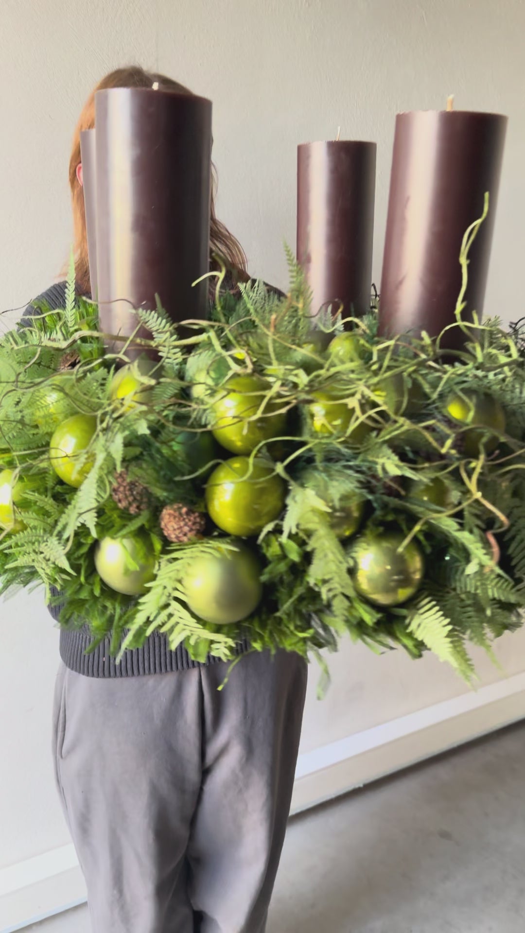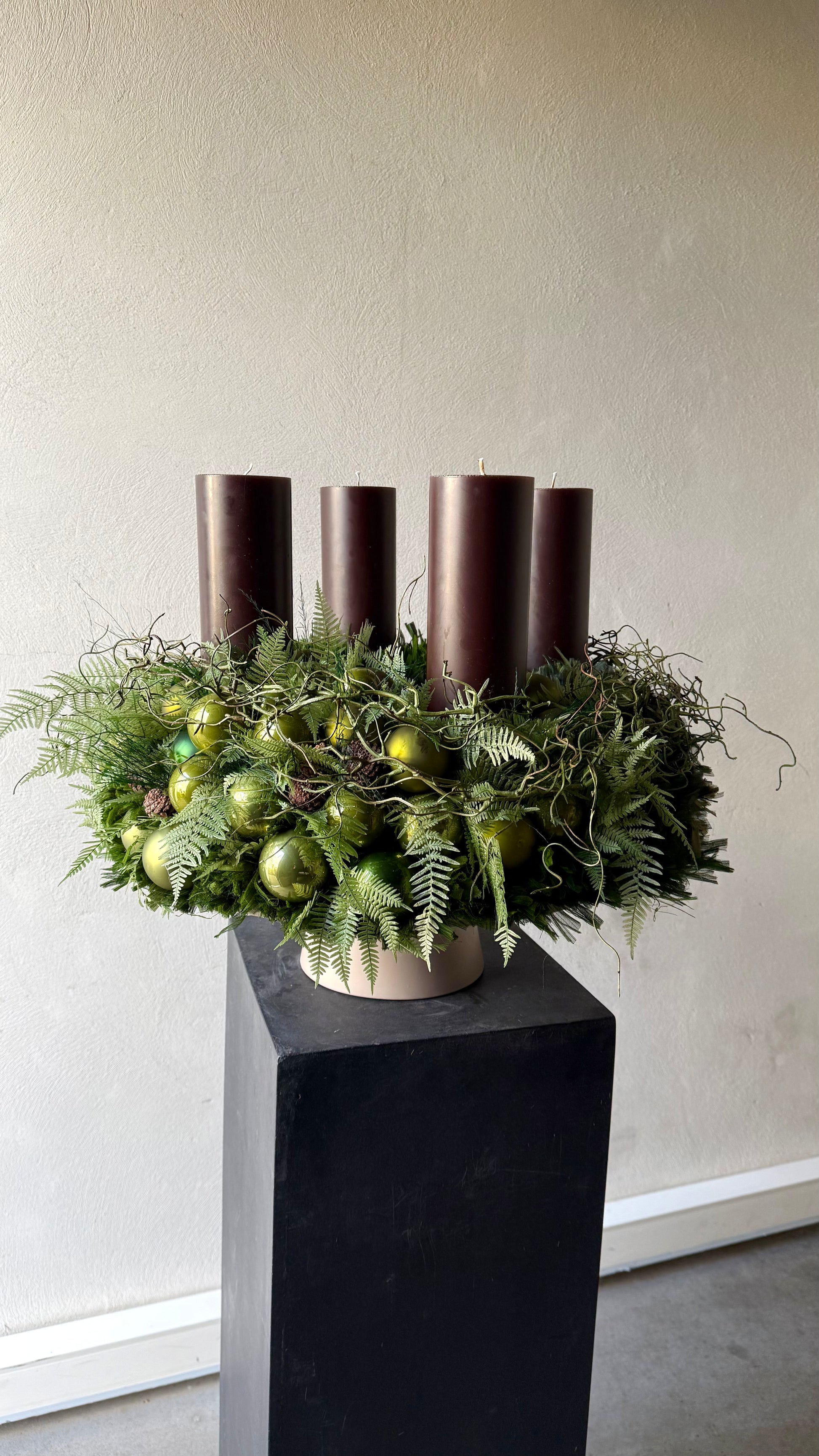 Kranzdurchmesser ca. 60cm. Kerzengrösse 24cm Höhe 9cm Durchmesser Weizenkorn durchgefärbt. Dauer-Adventskranz für den Wiedergebrauch geeignet