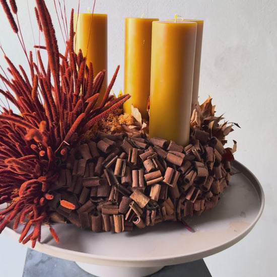 Kranzdurchmesser ca. 45cm. Mit asym. Deko ca 60cm. Kerzengrösse 18cm Höhe 6,6cm Durchmesser Weizenkorn durchgefärbt. Dauer-Adventskranz für den Wiedergebrauch geeignet